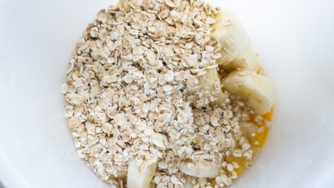 Snijd de bananen in plakjes en doe in een kom. Voeg de eieren en de havermout toe.