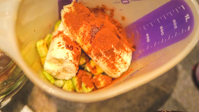 Doe de banaan, avocado, vanille aroma en de cacaopoeder in een kom of maatbeker zoals ik.