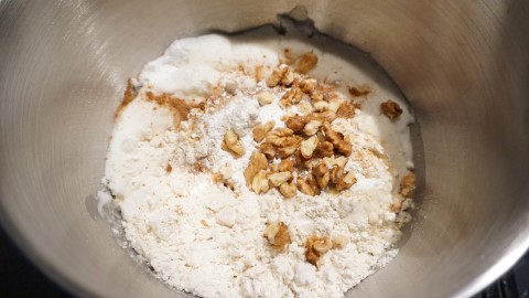 Doe nu alles in een kom en roer alles even goed door met een garde. Voeg een flink handje noten toe, ik heb walnoten gebruikt en roer alles nog even door.