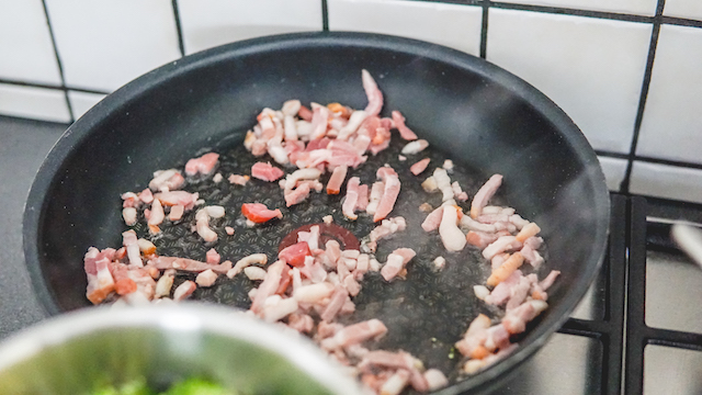 Doe de spekjes in hapjespan en bak een paar minuten voeg nu de lente-ui en de peper toe. En bak deze ruim 5 minuten.