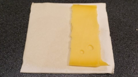 Bedek de helft van de bladerdeeg met een helft van een plak kaas, scheur deze doormidden. Hou je van veel kaas? Gebruik dan meer. Vouw dicht, en druk de rand dicht met een vork.