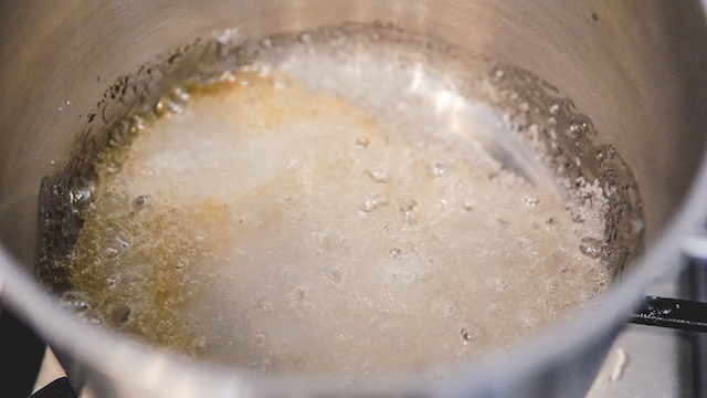 Maak als eerste de karamelsaus. Smelt in een steelpan de 100 gram suiker met het water.