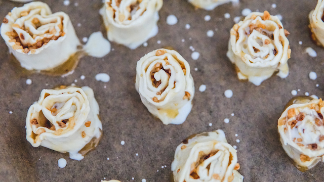 Gebruik het verse bladerdeeg uit de koeling in de supermarkt van Tante Fanny (0.01 lactose op 100 gram) of Ah. Maak zelf je karamelsaus en laat deze goed afkoelen. En de rest volgt vanzelf. Doe het rustig aan en neem er de tijd voor. De karamelsaus is al heel vaak mislukt bij mij, maar met dit recept kan het niet fout gaan dat verzeker ik je. Het oprollen van de bladerdeeg is ook even een geduldig werkje, maar uiteindelijk komen deze beauties zo uit de oven rollen.