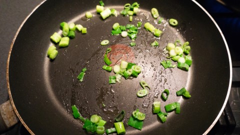 Doe de olijfolie in de koekenpan en voeg de lente-ui toe en bak zachtjes voor ongeveer 4 minuten.