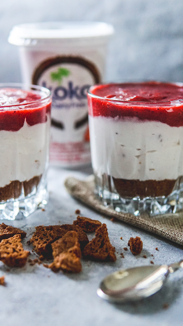 Zoek je nog een lekker toetje? Dan is dit laagjes dessert hetgeen wat je zoekt. Het is super makkelijk om te maken, en hij is ook nog eens super lekker. Ik had dit alternatief voor yoghurt met aardbei van Koko nog nooit gegeten. Het is gemaakt van vers geperste kokosnootmelk en gefermenteerd met levende zuivelvrije yoghurtculturen. Om hem iets romiger te maken heb ik hem gemengd met lactosevrije slagroom van MinusL, maar je kunt natuurlijk ook Alpro gebruiken.