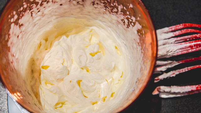 Klop de koude lactosevrije slagroom stijf met een half zakje klopfix.