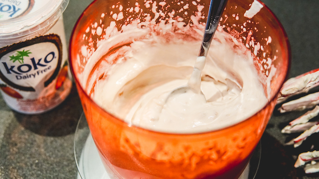 En verdeel dit mengsel over de aardbeien kokosyoghurt.