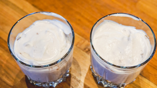 Dit recept is voor 2 personen. Het zijn flinke toetjes, dus heb je mindere trek dan kun je ze ook makkelijk in 4 kleine glaasjes verdelen.