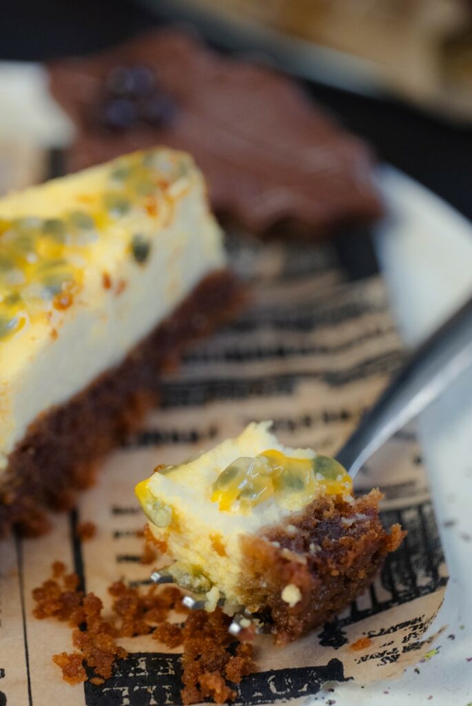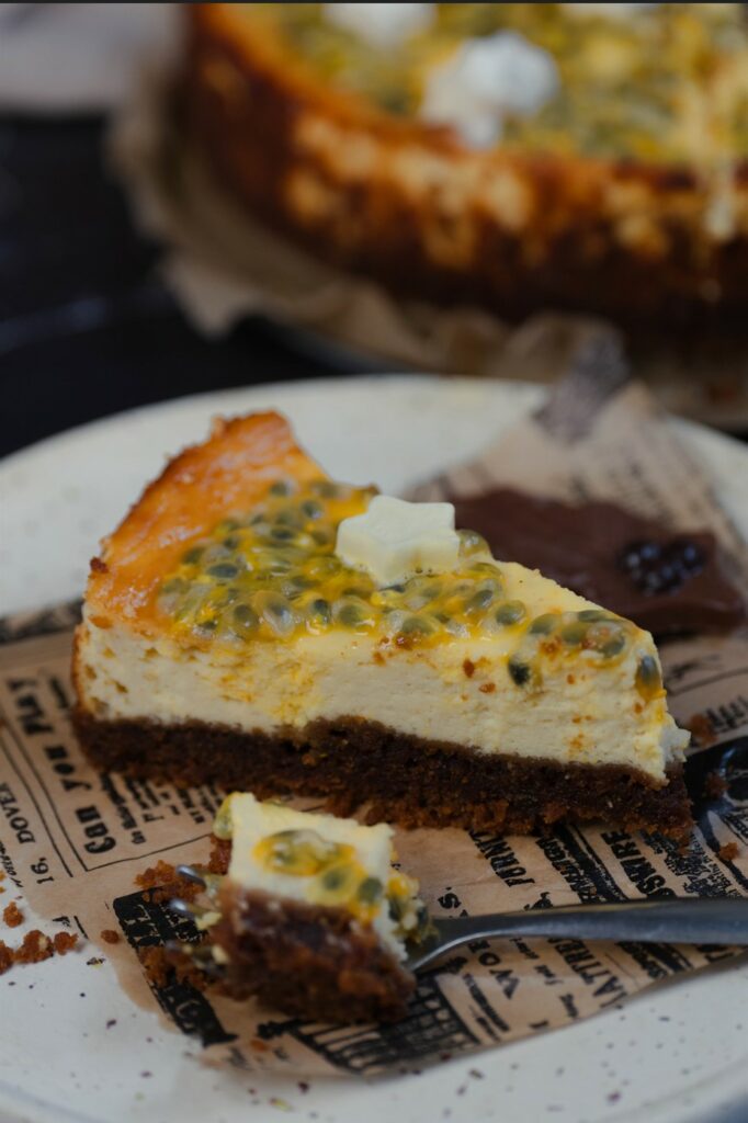 Zodra de cheesecake is afgekoeld verdeel je de passievruchten over de taart samen met wat sterretjes en vegan hulstblaadjes.