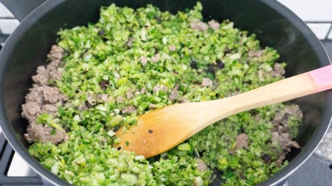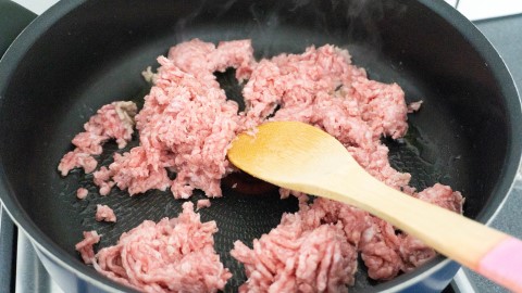 Doe de olijfolie/plantaardige boter in de pan en bak het gehakt rul en bruin.