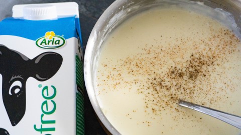 Maak ondertussen de bechamelsaus (staat uitgebreider op de website). Smelt de boter in een steelpannetje, zodra de boter gesmolten is voeg je al roerend de bloem toe. Giet nu scheutje voor scheutje de melk toe, doe dit heel rustig. En laat de bechamelsaus ook even pruttelen tussendoor. Blijf goed roeren, roer er telkens weer lactosevrije melk doorheen zodra de andere melk is opgenomen in het bloemmengsel. Voeg een snufje peper, nootmuskaat en zout toe.
