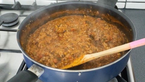 Voeg de tomatenblokjes, gezeefde tomaten, sambal en de 100 ml lactosevrije melk/room toe aan het gehaktmengsel. En voeg alle kruiden toe. Roer alles goed door elkaar en laat een paar minuten pruttelen.