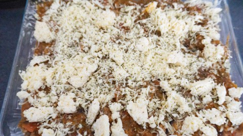 Strooi hier de (zelf) geraspte kaas overheen. Gebruik de kaas die je hebben kan. En strooi er nog wat Italiaanse kruiden overheen.