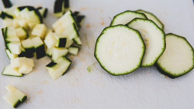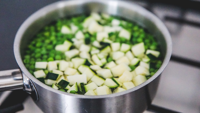 Kook de doperwten in ongeveer 7 minuten gaar en voeg de laatste 2 minuten nog even de blokjes courgette toe.