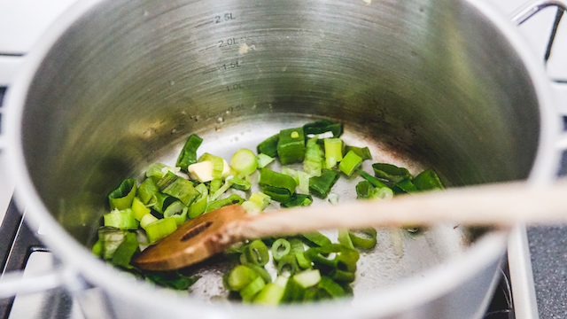 Verhit de lactosevrije boter in een hapjespan en fruit hierin de lente-ui.