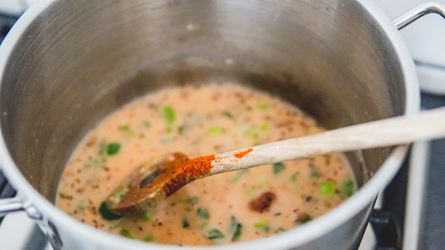 Voeg na 5 minuten de bloem toe en maak een roux. Maak van de roux een saus door al roerend rijstmelk toe te voegen.