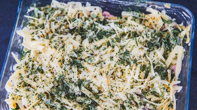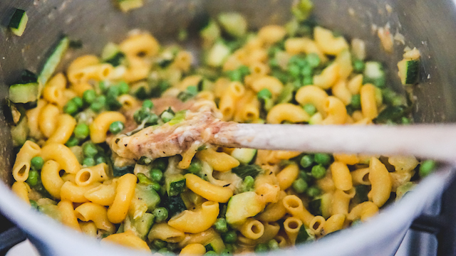 Voeg de macaroni, doperwten, courgette en de hamblokjes toe aan de saus en meng met de zelf geraspte kaas.