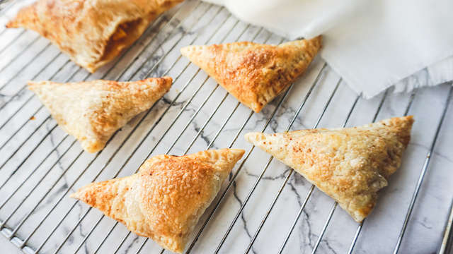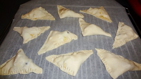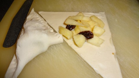 Snij de plakjes bladerdeeg door de helft. Leg in ieder stukje en voeg een lepel appelstukjes toe. Vouw de flapjes dicht.