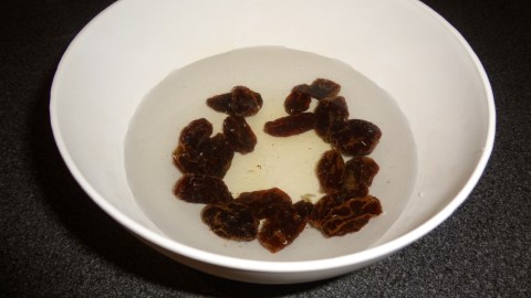 Kook een beetje water, laat even afkoelen. Doe de rozijnen of krenten in een schaaltje en giet het water over de rozijnen of krenten en laat 5 minuten wellen.
