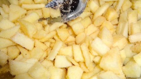 Schil ondertussen de appel, en snij in blokjes. Doe de stukjes in een schaal, voeg de suiker, rozijnen en de eetlepel kaneelsuiker toe. En roer even door.