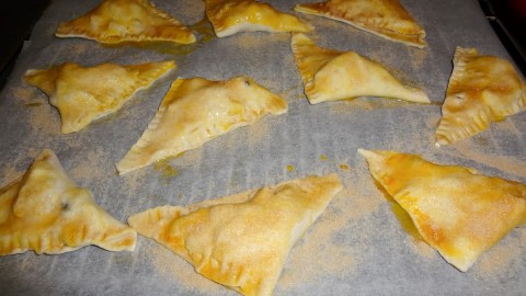 Bekleed een bakplaat met bakpapier en leg de appelflapjes hier op. Vervolgens als je ze allemaal dicht hebt gevouwen, klop je een ei los. En smeer het ei over de appelflapjes heen met een kwastje.