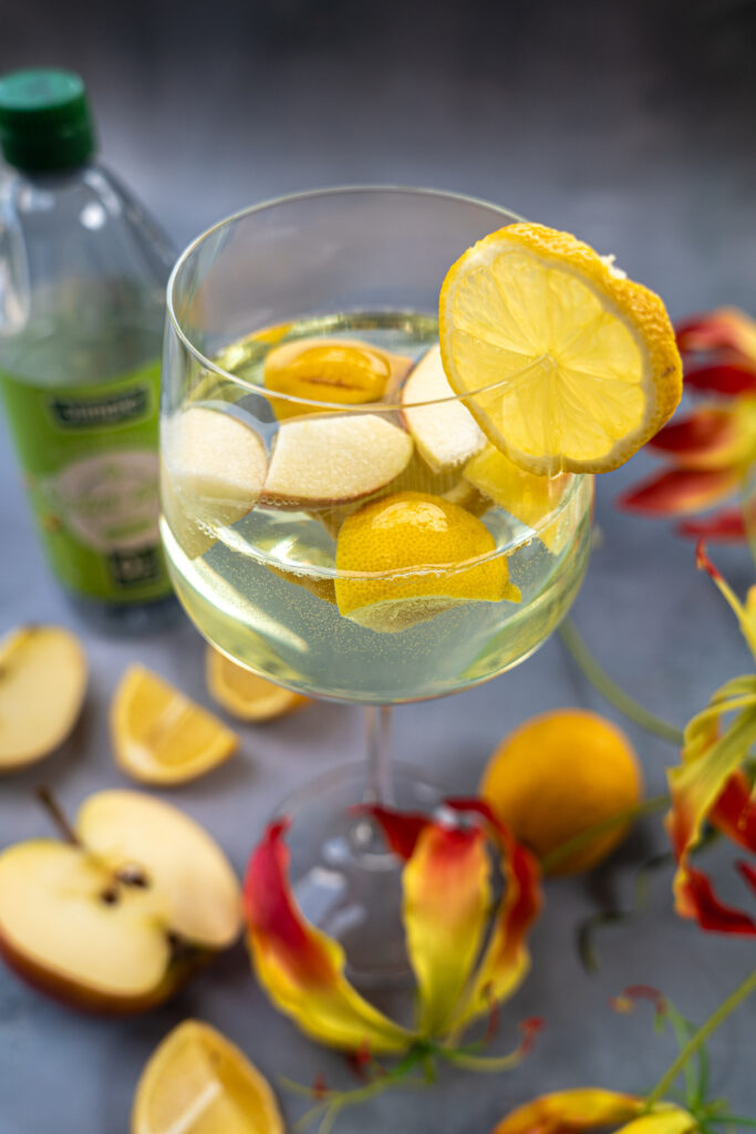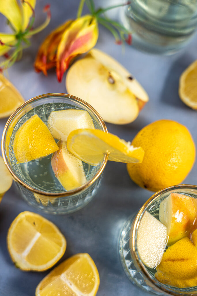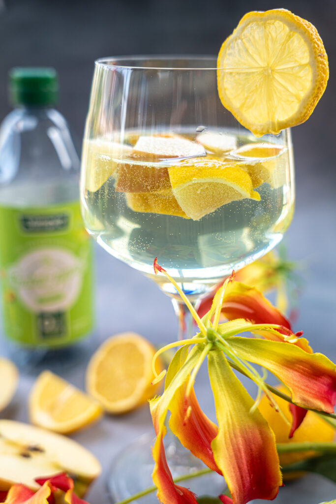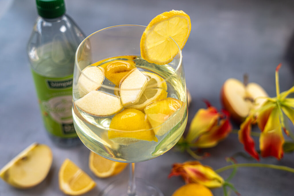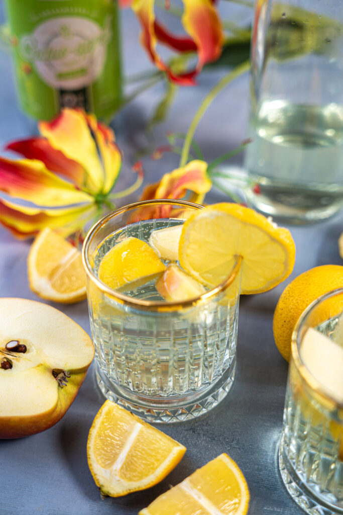 Was de appel, snij in vieren en ontdoe de appel van het klokhuis. Snij in stukjes en doe het in je borrel. Ook kun je schijfjes citroen snijden en deze op het glas zetten als garnering!