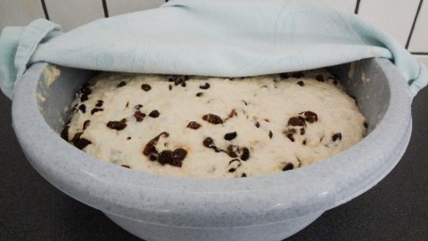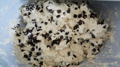 Voeg de krenten en de rozijnen toe en roer nog even goed door.