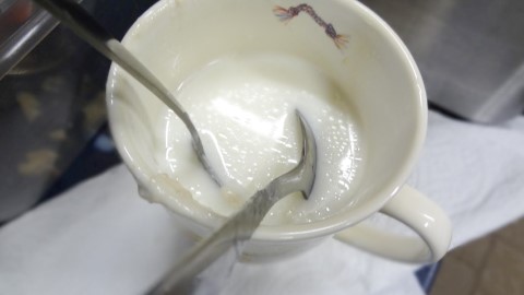 Zet een mok met lactosevrije melk klaar, dat zorgt ervoor dat het beslag goed van je lepels glijd, één grote opscheplepel en twee kleinere lepels en twee vergieten met flink wat keukenrol erin.
