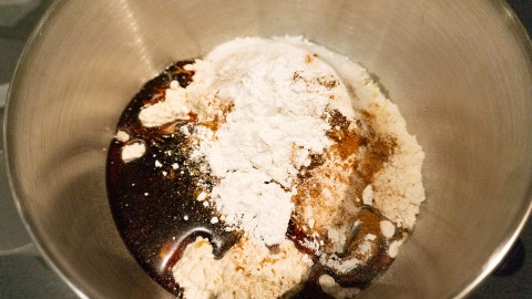 Pak een kom en doe hier alle ingrediënten in. Roer nu ongeveer 5 minuten alles goed door met een houten spatel/lepel. Als het goed is heb je nu een egale massa. Zo niet spatel alles net zolang door totdat wel zo is.