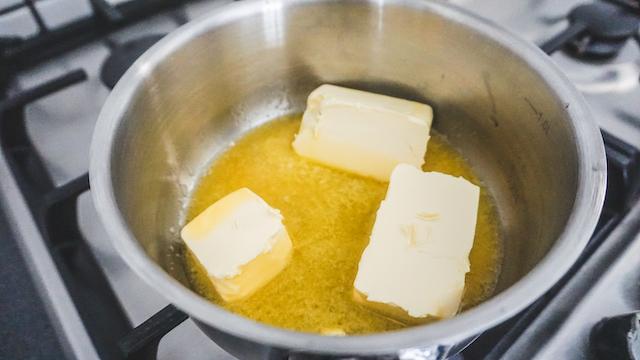 Doe de kruimels bij de lactosevrije boter en roer dit goed door.