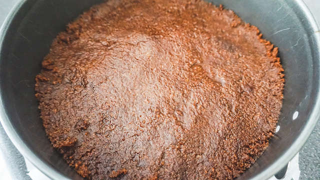 Stort het mengsel nu in de springvorm op de koekbodem. Hij is nu heel dun.