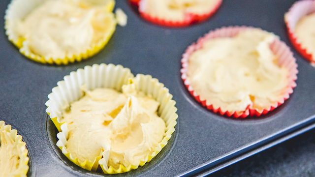 Doe je papieren bakvormpjes in een muffin bakvorm, ik had een siliconen gebruikt. Pak nu tussen 2 eetlepels een beetje cupcake beslag en leg het in elk bakvormpje. Verdeel het over alle 12 de cupcakes. Bak ze in de oven ongeveer 15-20 minuten gaar, prik er met een cocktailprikker in om te kijken of ze gaar zijn.