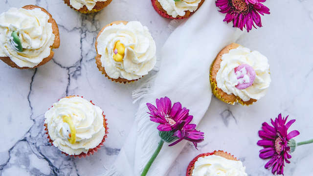 Doe de botercreme vervolgens in een spuitzak, en spuit flinke toeven botercrème op de cupcakes. Versier met de suikerdecoratie in de sfeer van Pasen.