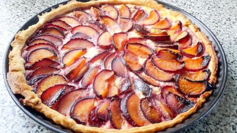 En zijden tofu verwarmd met een scheutje kokosmelk, twee eieren en twee zakjes vanillesuiker en dat gestort op het bladerdeeg en de pruimpjes erop gelegd.