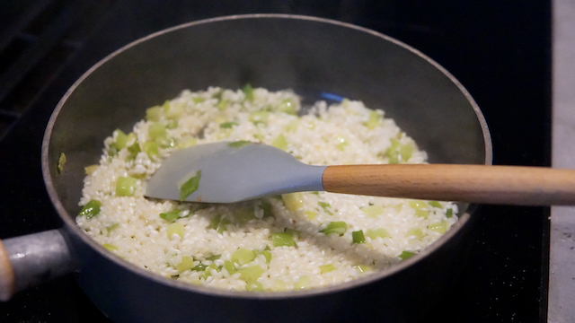 Snij de lente-ui (of ui) fijn en voeg toe. Bak een paar minuten en voeg de risottorijst toe en bak deze glazig. Roer alles even goed door elkaar.