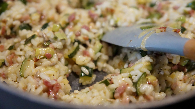 Deze risotto met courgette is een heerlijk smeuïg hoofdgerecht met spekblokjes en kruiden.