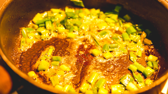 Laat in dezelfde pan een klontje boter smelten en fruit de lente-ui hier een paar minuten in.