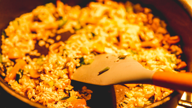 Voeg pas een nieuwe scheut water toe als een vorig deel volledig door de rijst is opgenomen.