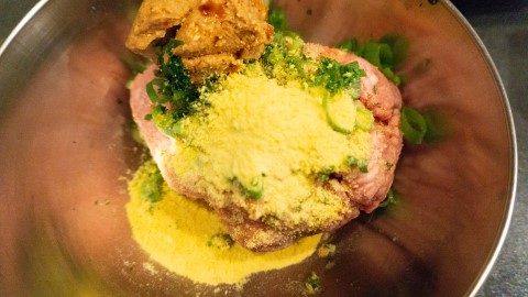 Zeef daarboven de beschuiten (of gebruik ongeveer 16 gram paneermeel). En kneed nu alles tot een mooi smeuïg gehaktmengsel.