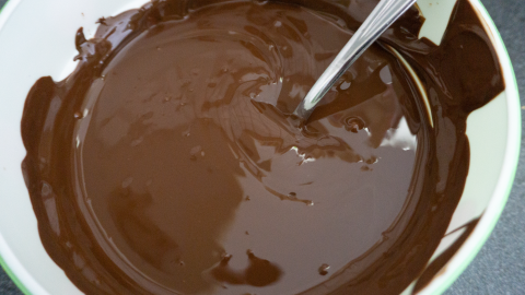 Meng de gesmolten chocola met de slagroom met een spatel.