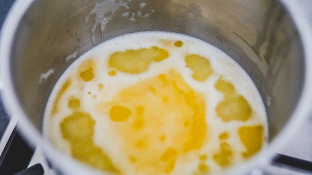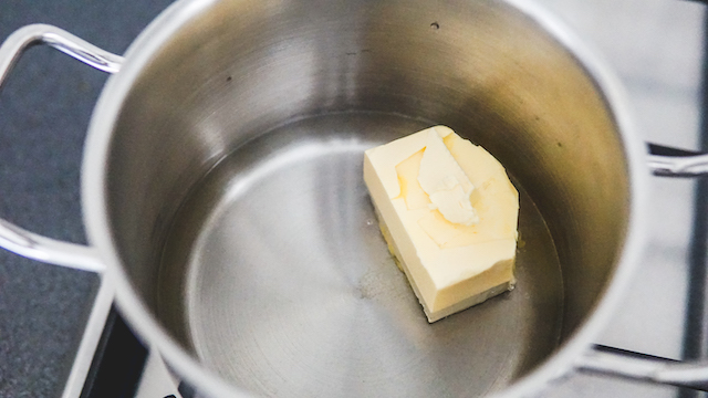 Doe de lactosevrije boter, water, en het snufje zout in een kookpan. Laat de boter smelten en breng nu alles vervolgens aan de kook.