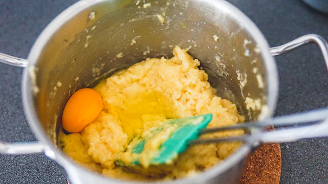 Voeg de eieren 1 voor 1 toe. En blijf tussendoor heel goed roeren met de spatel totdat het ei is opgenomen en voeg het volgende ei toe. Blijf net zolang roeren totdat het een egaal mengsel is geworden.