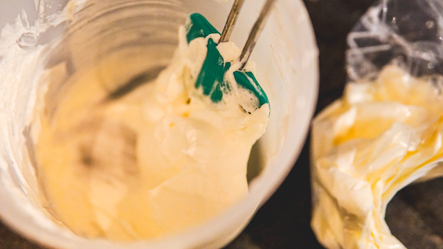 Klop ondertussen de koude lactosevrije slagroom met de zakjes klopfix en de suiker stijf met de mixer.
