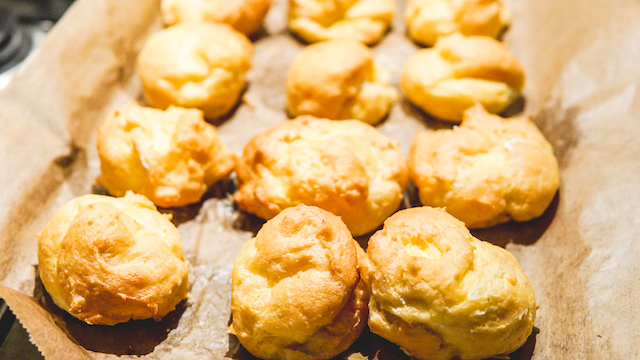 Schep 12 bolletjes op een met bakpapier beklede bakplaat met 2 lepels of gebruik een spuitzak en spuit mooie toeven. Zorg dat de bolletjes genoeg uit elkaar liggen. Bak de soezen in circa 20 minuten goudbruin.