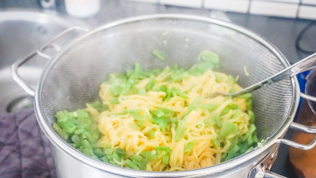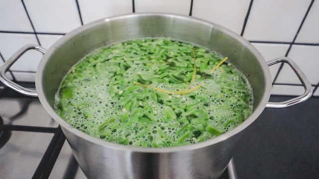 Breng een pan met water aan de kook. En voeg de spaghetti toe. Volg de aanwijzingen op de verpakking. En kook de snijbonen ook mee (ongeveer 5-10 minuten).