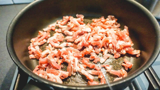 Verhit de olijfolie in een koekenpan en bak de spekjes.