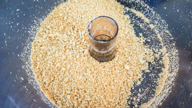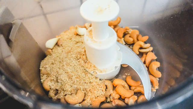 Maak nu de 'Parmesan'. Doe de gezouten cashewnoten, 2 tenen knoflook en 3 eetlepels edelgistvlokken in de blender of keukenmachine.