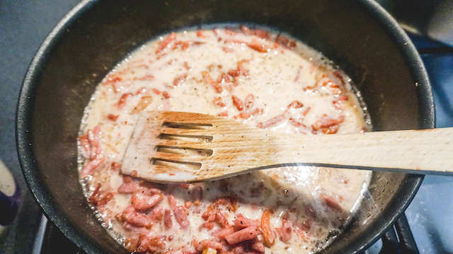 Vuur uitzetten en dan het 'parmesan'-eimengsel erdoor roeren. Ei stolt snel dus goed om blijven scheppen.