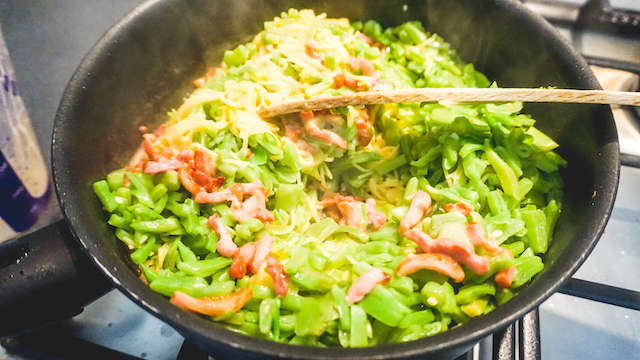 Spaghetti en snijbonen afgieten en meteen omroeren met het spekroommengsel.