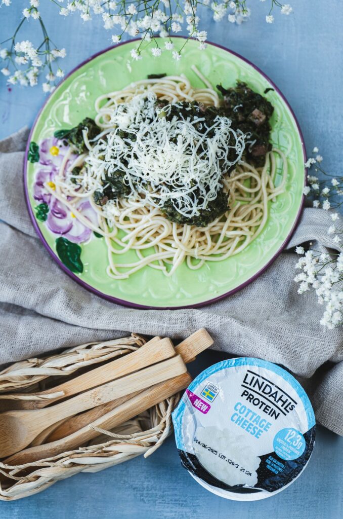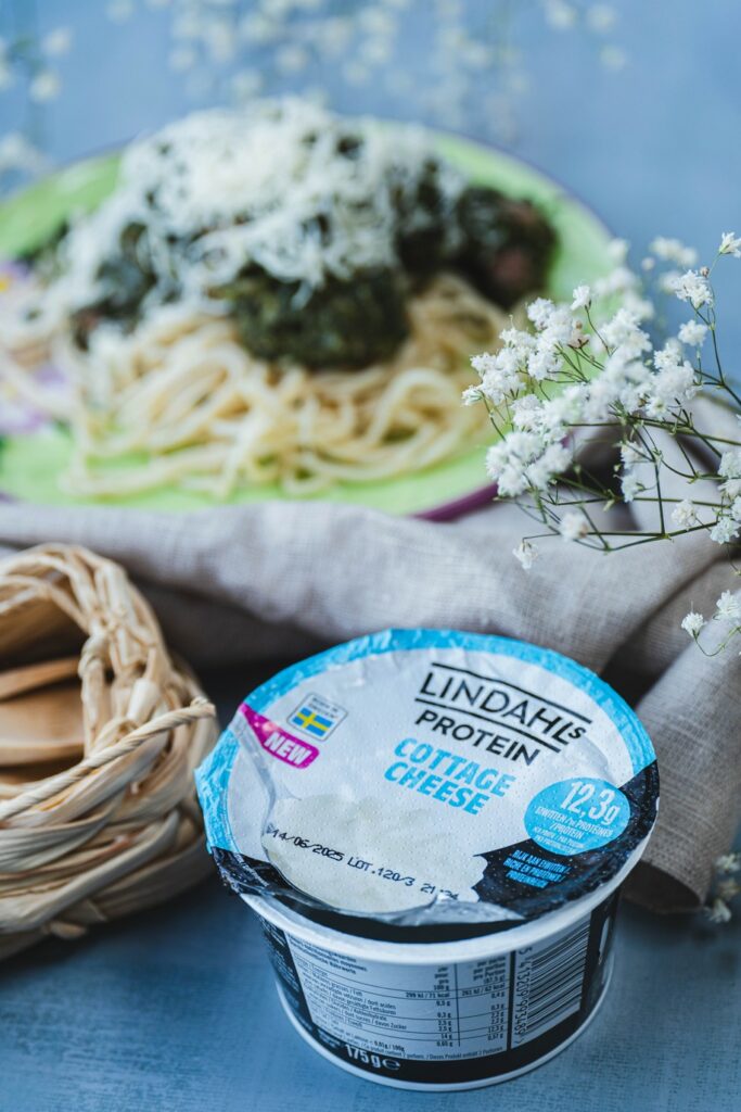 Sinds kort heeft Linda hls lactosearme cottage cheese. En dit heb ik nu standaard in mijn koelkast staan. Zo lekker en erg voedzaam want het is rijk aan eiwitten en laag in vet. Er is lactase toegevoegd aan het product. Dus het bevat nog 0.01 gram lactose op 100 gram cottage cheese. Je proeft geen verschil en het smaakt verrukkelijk door de spaghetti met spinazie. Check blog onderaan even voor meer informatie over kan sporen van melk bevatten en kaas eten met een lactose-intolerantie.